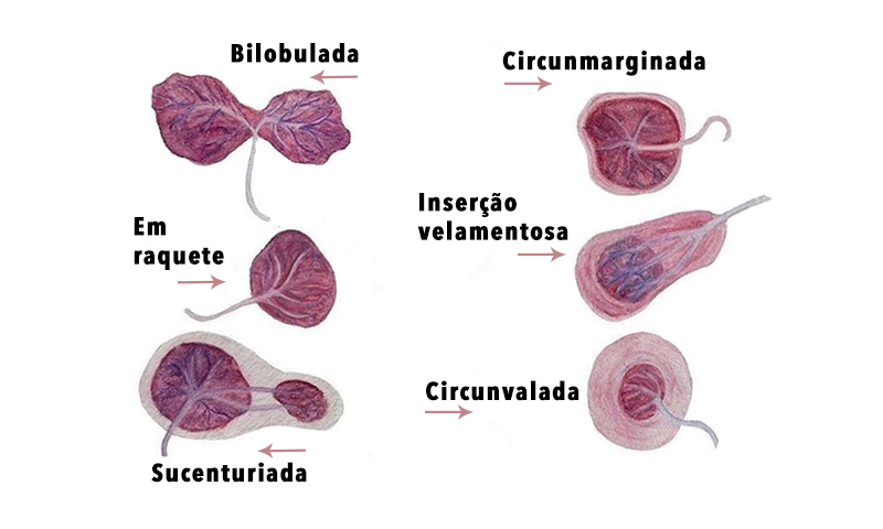 Bilobulada ou bipartida: ocorre quando há dois ou três lobos completamente separados. Cada lóbulo possui um cordão umbilical, que são unificados em seguida. Geralmente sem repercussão clínica.